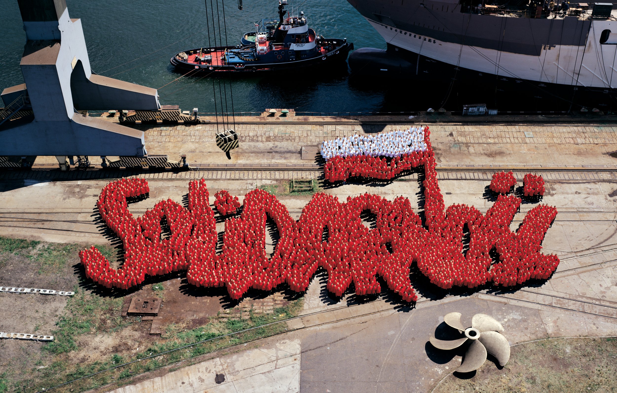 Dyptyk Solidarność to fotografie wykonane przez Piotra Uklańskiego na terenie Stoczni Gdańskiej - tam, gdzie w 1980 roku wskutek strajków pracowniczych powstała Solidarność. Ten związek zawodowy stał się masowym, ogólnopolskim ruchem społecznym opozycyjnym wobec PRL-owskich władz. Uklański w spektakularny sposób przetworzył słynne logo Solidarności, zaprojektowane przez Jerzego Janiszewskiego. Z grupy około 3000 statystów - żołnierzy w czerwonych i białych strojach ułożył napis Solidarność wraz z biało-czerwoną flagą i sfotografował go ze znacznej wysokości ujmując w kadrze zabudowania stoczni. Pierwsza fotografia wiernie oddaje logotyp Solidarności, na drugiej zaś żołnierze rozchodzą się, czyniąc napis nieczytelnym. Jak pisze o tej pracy Andrzej Szczerski, wskazuje ona, że ”[…] wspólnotowe działania mogą być wymuszone i służyć propagandowym celom, ale także być́ wynikiem indywidualnej decyzji poszczególnych ludzi, jak w wypadku „Solidarności”. Fotografie reprezentowały tych, którzy potrafią̨ się̨ zjednoczyć, aby w ten sposób osiągnąć ważny dla nich cel. Jednocześnie, odnosząc się̨ do realiów czasów transformacji, dowodziły, że taka dobrowolna wspólnota nie jest dana raz na zawsze i w każdej chwili może przestać istnieć, a działanie kolektywne zastąpi indywidualizm” (katalog wystawy Transformacja. Nowoczesność w III RP, 2024). Sposób, w jaki Uklański sfotografował tłum anonimowych osób będących składnikami „żywego obrazu”, nawiązuje do wykonywanych na zlecenie Armii USA w latach 1915-20 fotografii propagandowych, tzw. living photographs, Arthura Mole’a i jego asystenta Johna Thomasa, w których ludzie są jedynie masą: narzędziem do zbudowania efektownego obrazu. Tradycja tych aranżowanych ujęć została przejęta przez kraje komunistyczne (takie obrazy układano podczas defilad i świąt państwowych), trwa również w świecie sportu. Sam Uklański po raz pierwszy wykorzystał ten sposób, gdy w 2004 w pracy Bez tytułu (Ioannes Paulus PP. II Karol Wojtyła) - praca dziś w zbiorach MSN w Warszawie) ułożył twarz papieża Jana Pawła II przy pomocy grupy 3500 brazylijskich żołnierzy: półnadzy mężczyźni składali się na skórę twarzy, zaś większa grupa ubrana na biało „odegrała” włosy, piuskę i fragment sutanny.
