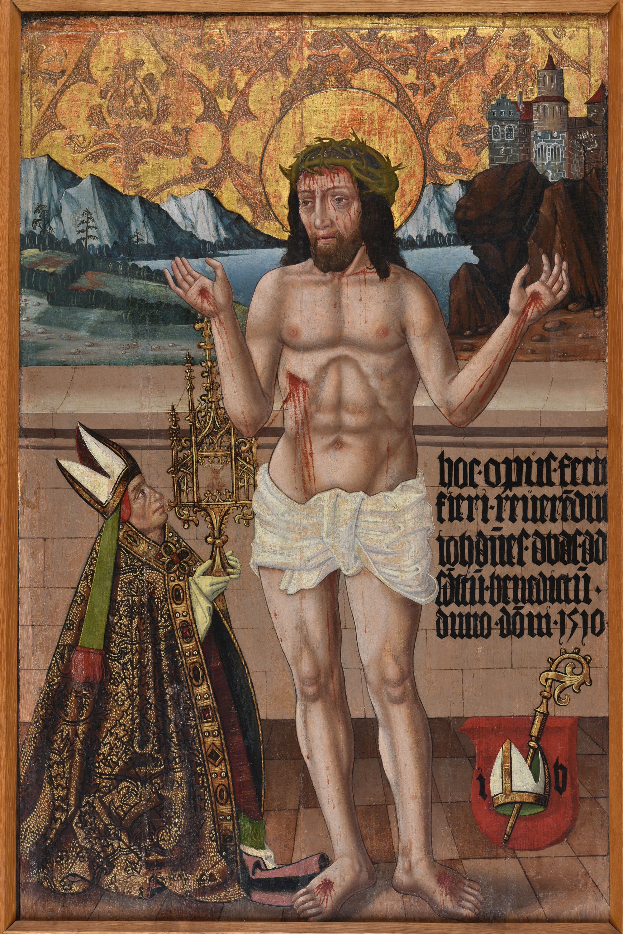 Bańskie (region górniczy w dzisiejszej Środkowej Słowacji) Chrystus jako Męż Boleści, z donatorem, Janem, opatem klasztoru w Świętym Benedykcie nad Hronem (SK) kwatera nastawy ołtarzowej z kaplicy Krwi Świętej przy tymże klasztorze 1510 Ostrzyhom (Esztergom, HU), Keresztény Múzeum drewno sosny, tempera fot. Attila Mudrák